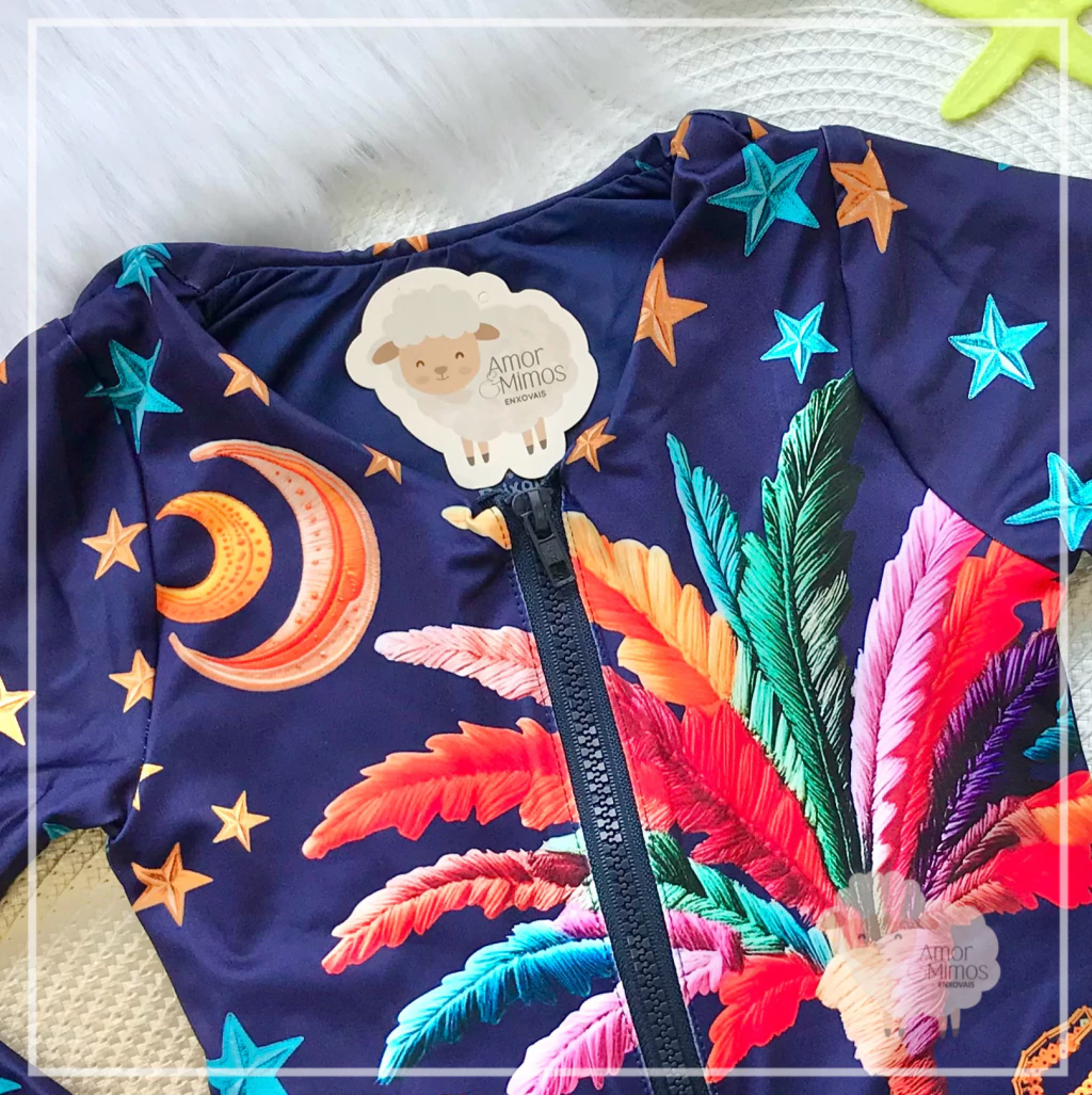 Confeccionado em lycra com fator de proteção UV 50+ que tem uma estrutura capaz de bloquear a radiação.